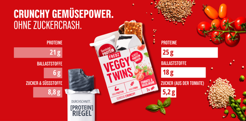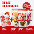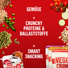 5× VeggyTwins (herzhafte Proteinriegel) + 9× VeggyCrunch, je 3 pro Sorte. (crunchiger Gemüse-Mix)